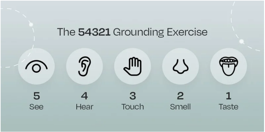 The 5-4-3-2-1 Grounding: Name 5 things you see, 4 you can touch, 3 you hear, 2 you smell, and 1 you can taste.